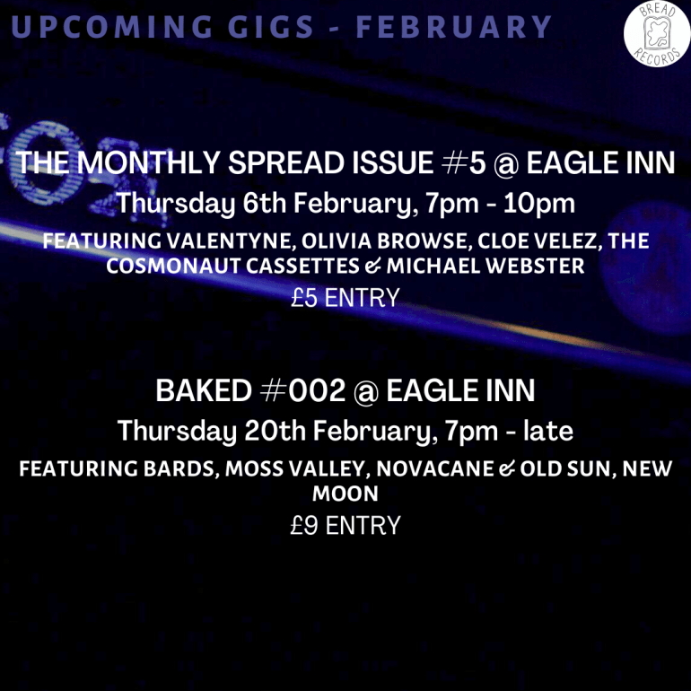 tomorrow evening we’re down at the Eagle Inn for our fifth issue of “The Monthly Spread“, and a fantastic lineup in store with Valentyne Olivia Browse Cloe Velez The Cosmonaut Cassettes and michael webster – 7pm start, only a fiver in! ![]()