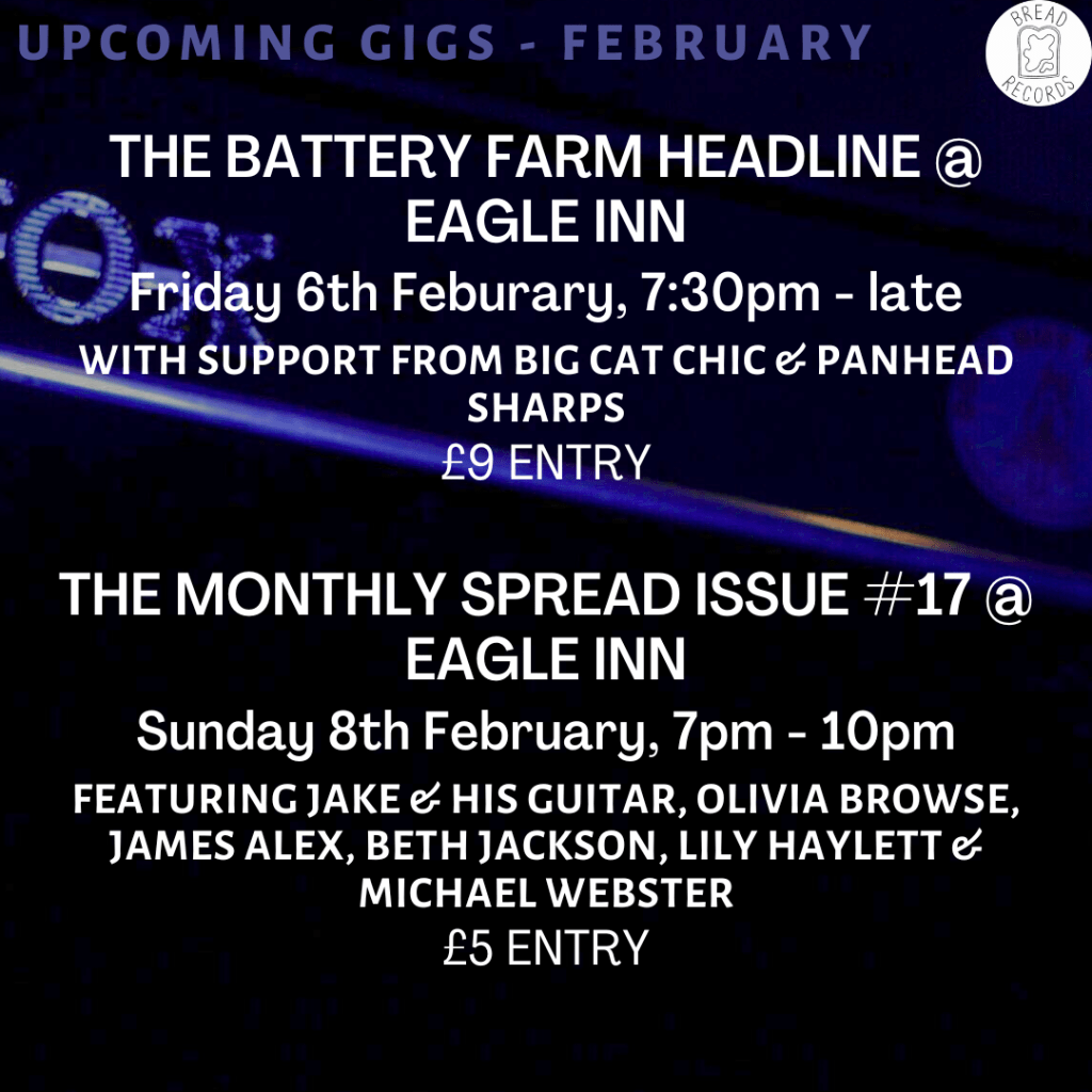 then on Sunday we’re back at the Eagle Inn for our next issue of “The Monthly Spread“, with Jake & His Guitar, Olivia Browse, James Alex, Beth Jackson, Lily Haylett and our michael webster – starts at 7pm! ![]()