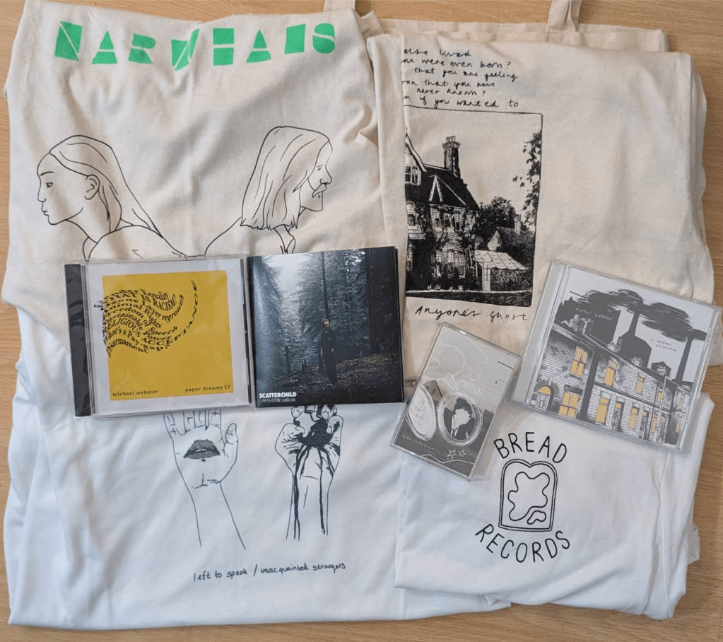 we’ve got CDs, cassette tapes, and t-shirts from Anyoneโs Ghost michael webster Narwhals and Scatterchild – well worth checking out to support Manchester musicians ![]()