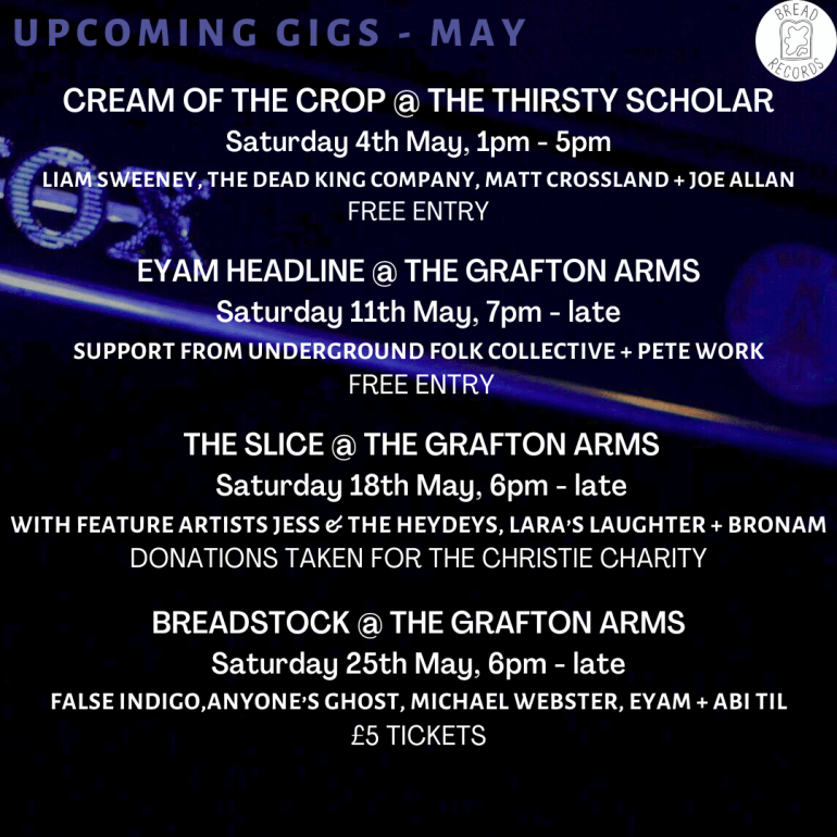 we’ve got an absolutely stacked May in store for us with so many gigs! kicking off Saturday at The Thirsty Scholar for our matinée Cream of the Crop show, with the talents of Liam Sweeney The Dead King CompanyMatt Crossland and Joe Allan